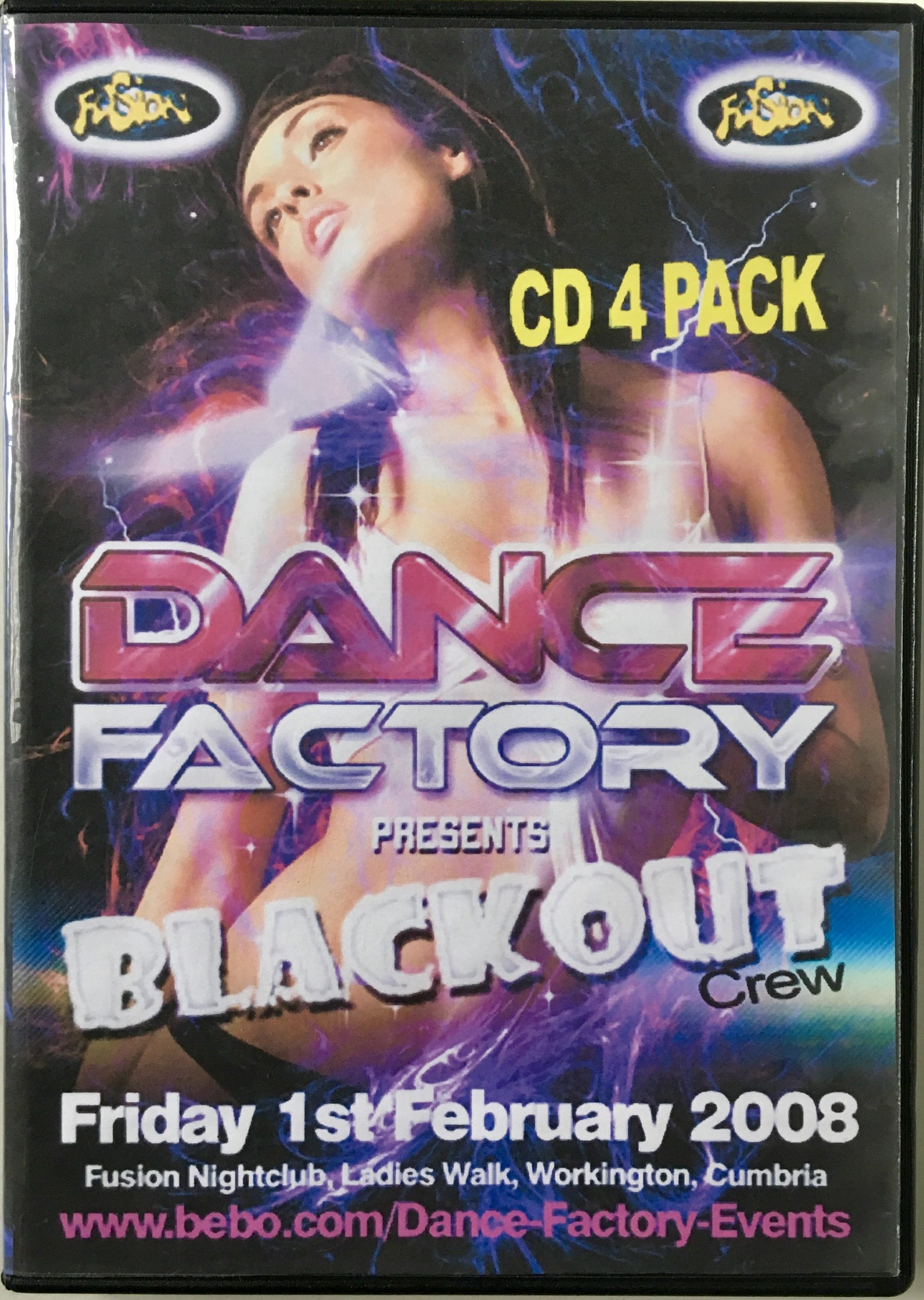The massive Blackout Crew touch down at the Dance Factory for a night of musical madness. This tasty 4 x CD pack was recorded live at Fusion Nightclub, Workington on Friday 1st February 2008 and features Special Guests DJ’s Siddy B, Jonezy & MC’s Cover, Zak K, Viper, Monson from the Blackout Crew alongside DJ’s Dobby, Andy K, Olie Ste, Limit, Lenardz plus MC’s Fergie and Bergos.