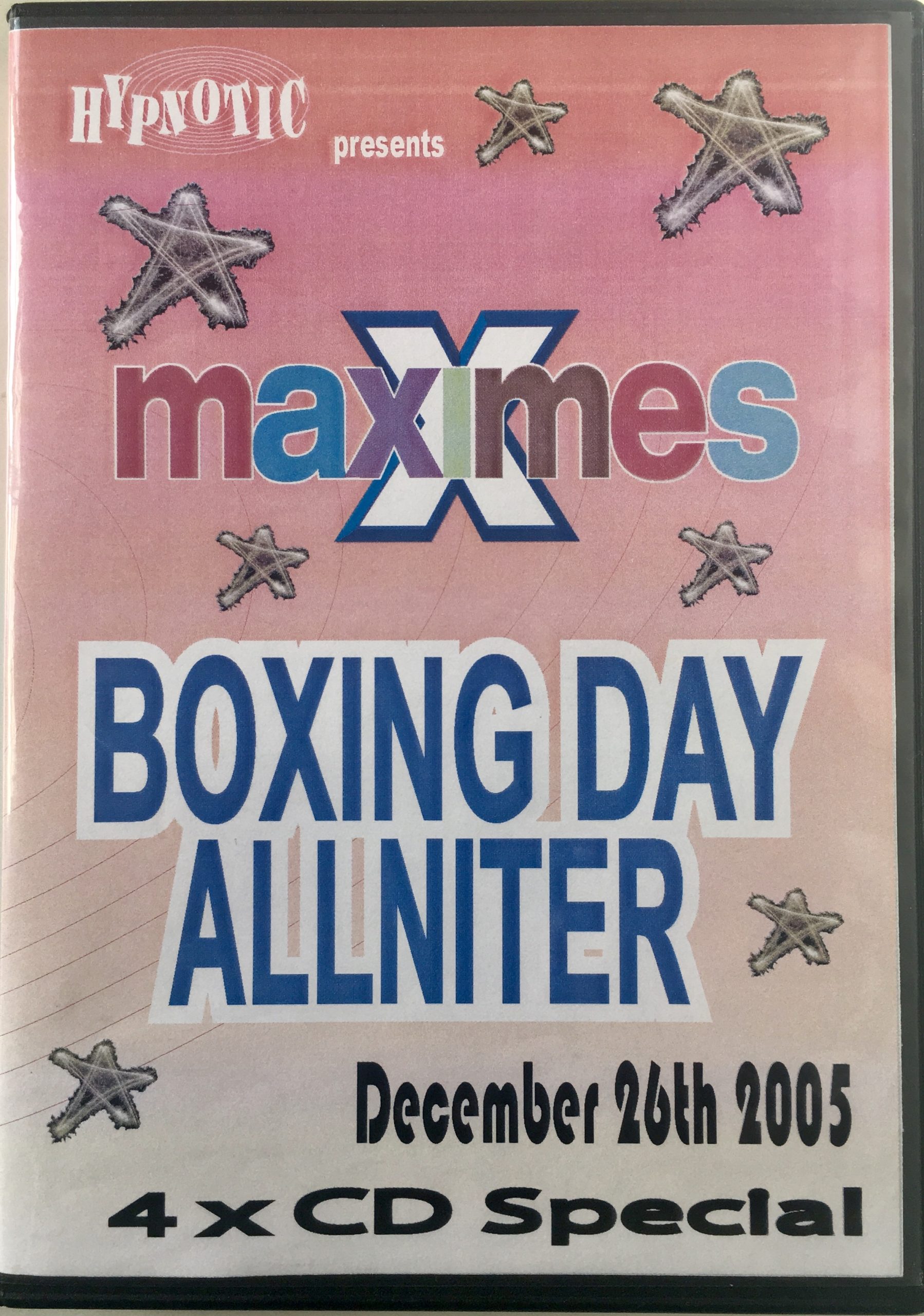 Excellent and RARE 4 x CD pack recorded live at Maximes Nightclub, Wigan on Boxing Night 26th December 2005. Featuring DJs Tomm, Rick Jones, Rhythm FX, Pete Daley, Jamie Agar, Ectic, Gary Hypnotic and the hosts on the mic MCs Blaze, Scotty G, MC G, Roach, Motty and Finchy.