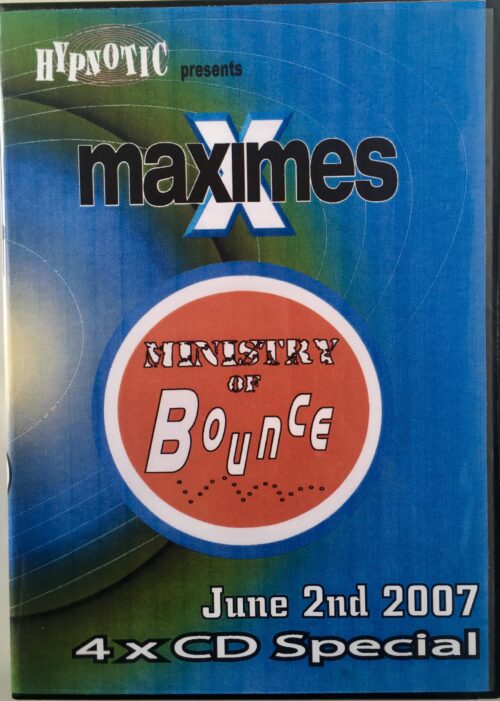 Another night of the biggest and bounciest tunes around brought to you straight from Maximes Nightclub, Wigan UK. This 4 x CD pack was recorded live at the Ministry of Bounce event on Saturday 2nd June 2007 and features DJ’s Tomm, Gary Hypnotic, Greenie, Jacko, Jamie Agar, Pete Daley, Pete M plus MC’s Efeeze, EM:DMC and Whitey.