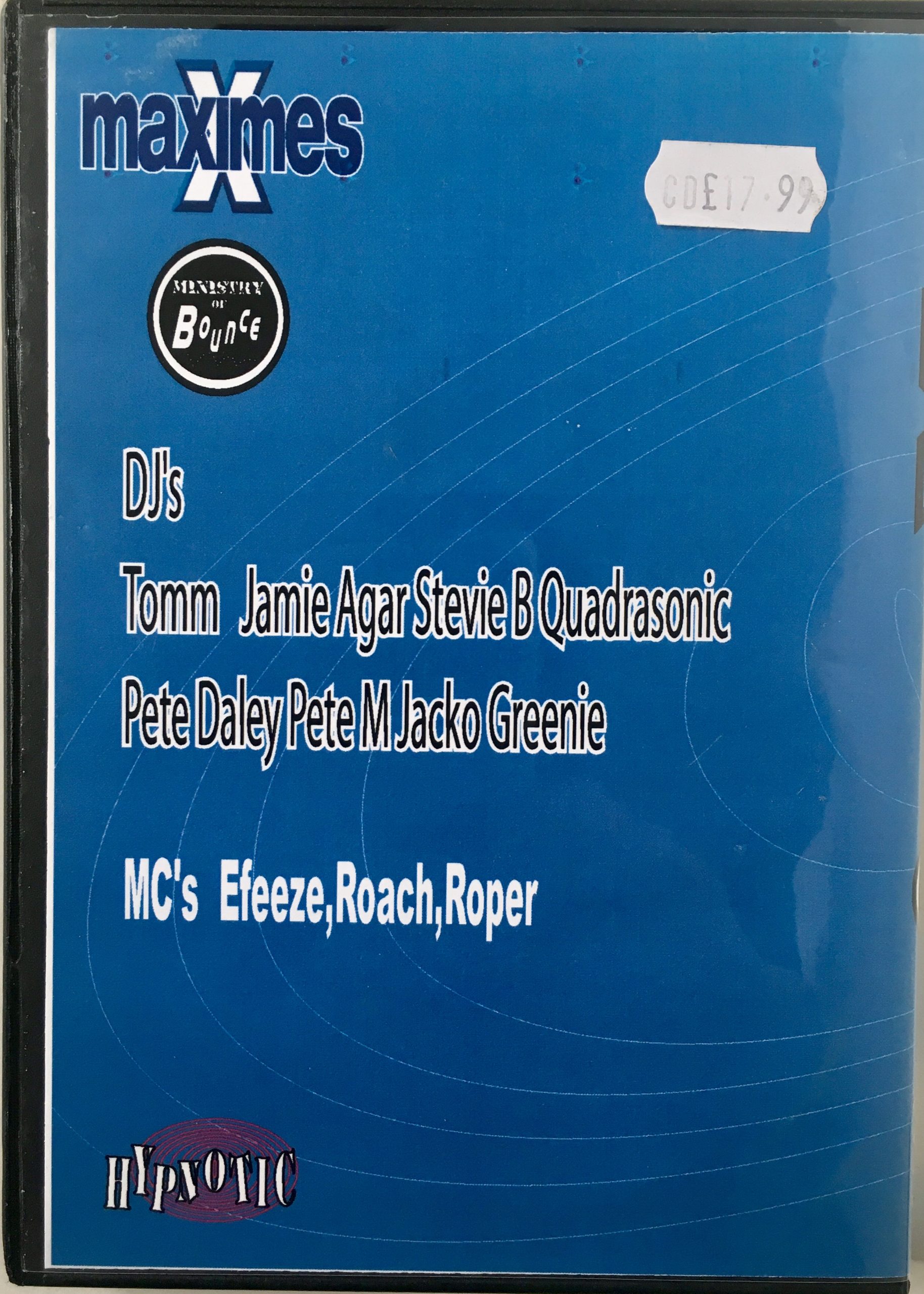Another night of the biggest and bounciest tunes around brought to you straight from Maximes Nightclub, Wigan UK. This 4 x CD pack was recorded live at the Ministry of Bounce event on 3rd June 2006 and features DJ`s Tomm, Jamie Agar, Stevie B, Quadrasonic, Pete Daley, Pete M, Jacko, Greenie plus your host MC`s Roach, Efeeze and Roper.