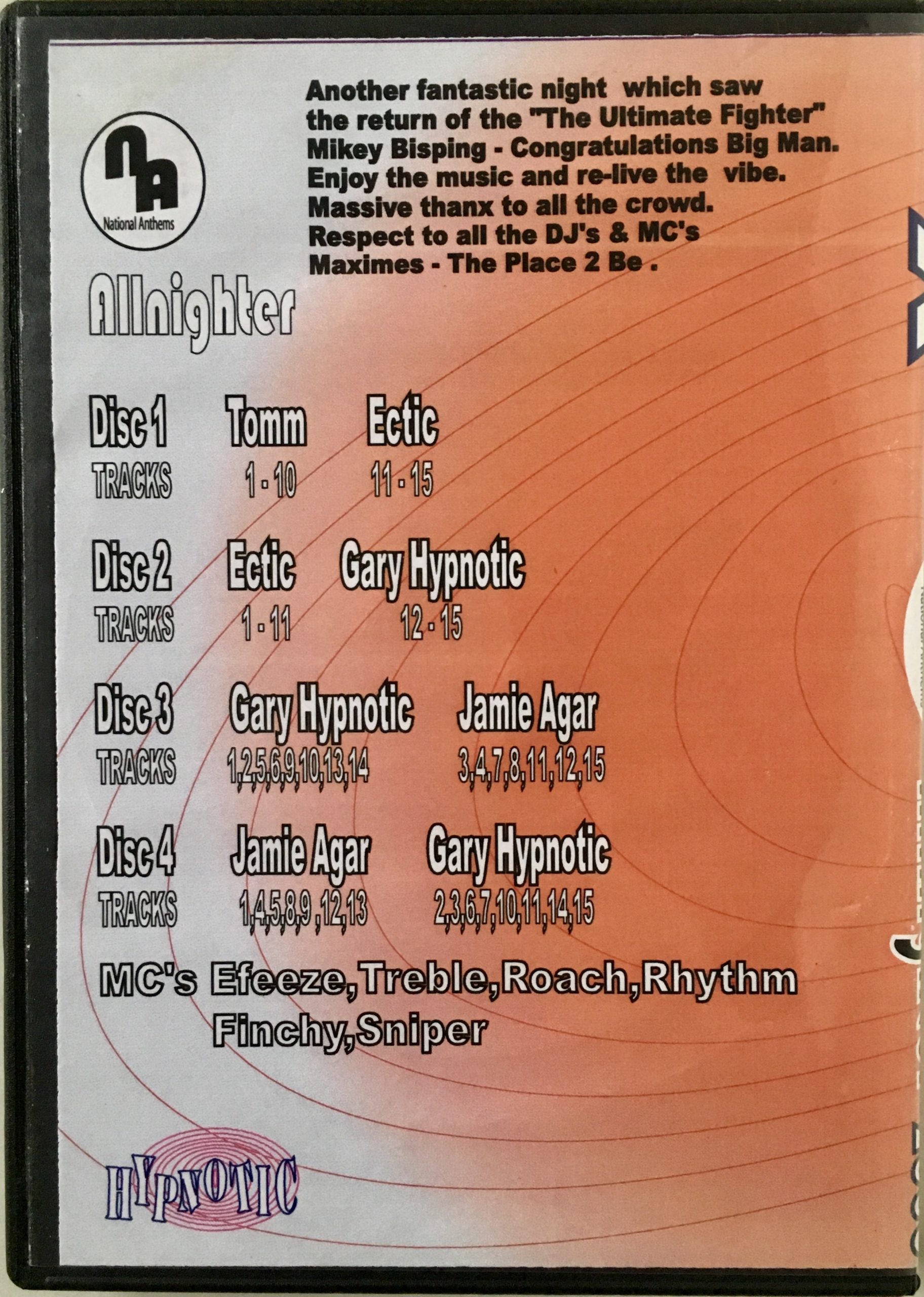 Hot 4 x CD pack recorded live at Maximes, Wigan on July 15th 2006 featuring DJ’s Tomm, Ectic, Gary Hypnotic, Jamie Agar plus MC’s on the mic Efeeze, Treble, Roach, Rhythm, Finchy and Sniper.