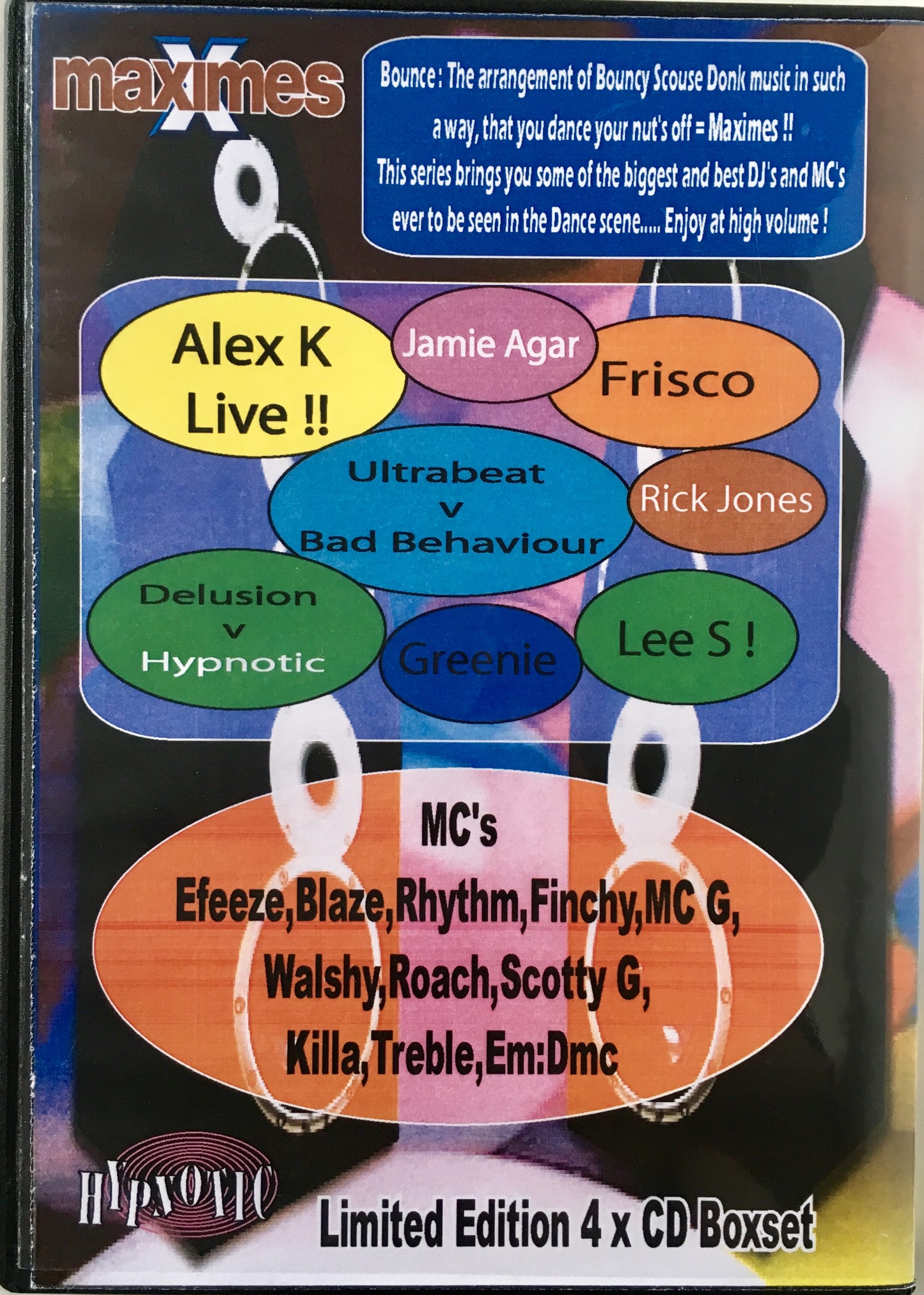 Limited Edition 4 x CD boxset charting the history of Maximes through some of the key DJ’s and MC’s who helped form the club and the bounce scene into the force it is today. This brand new series will feature performances from DJ’s Alex K, Jamie Agar, Frisco, Rick Jones, Lee S, Greenie, Ultrabeat, Bad Behaviour, Delusion, Hypnotic and MC’s Efeeze, Blaze, Rhythm, Finchy, MC G, Walshy, Roach, Scotty G, Killa, Treble, EM:DMC. A proper piece of history !