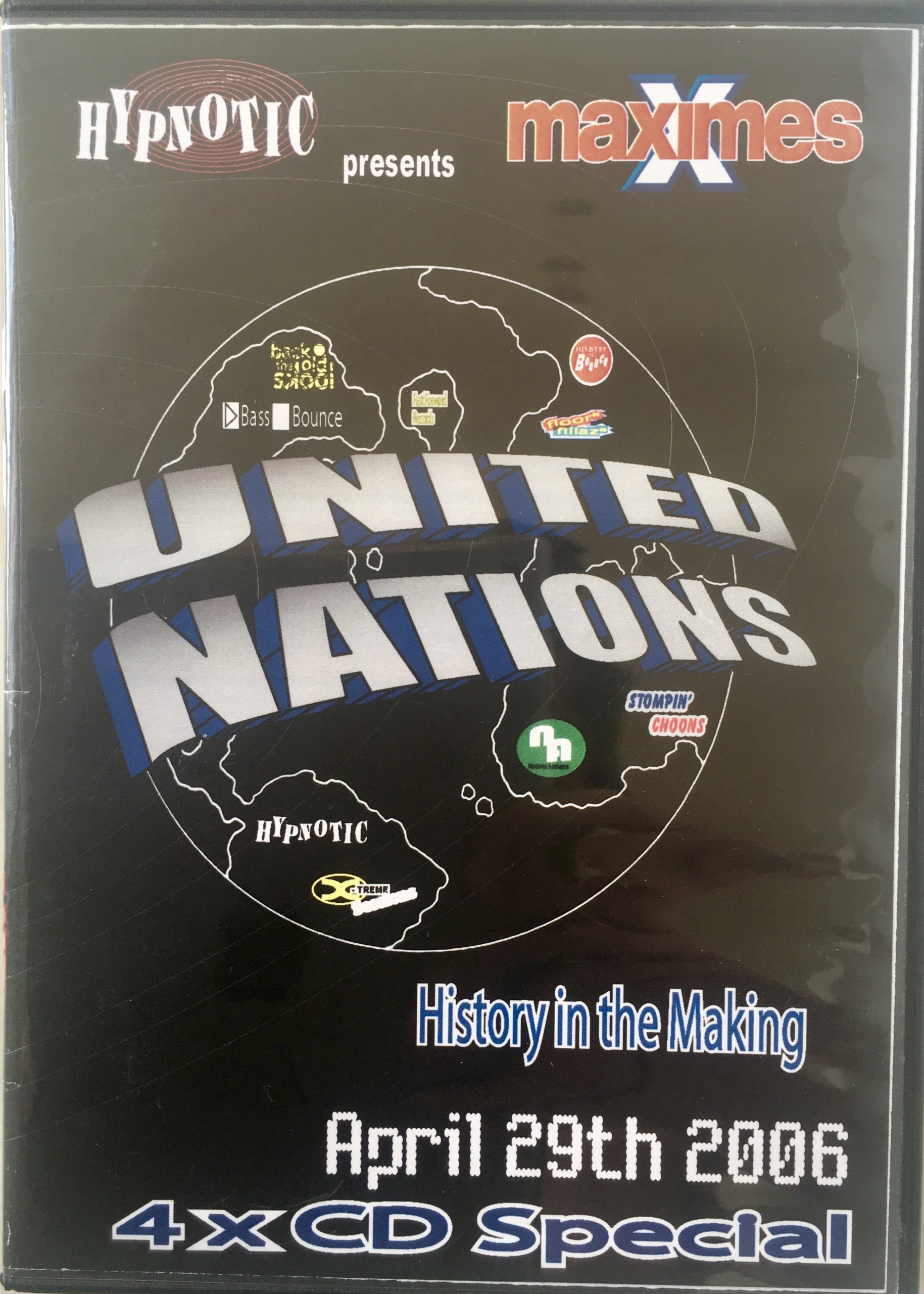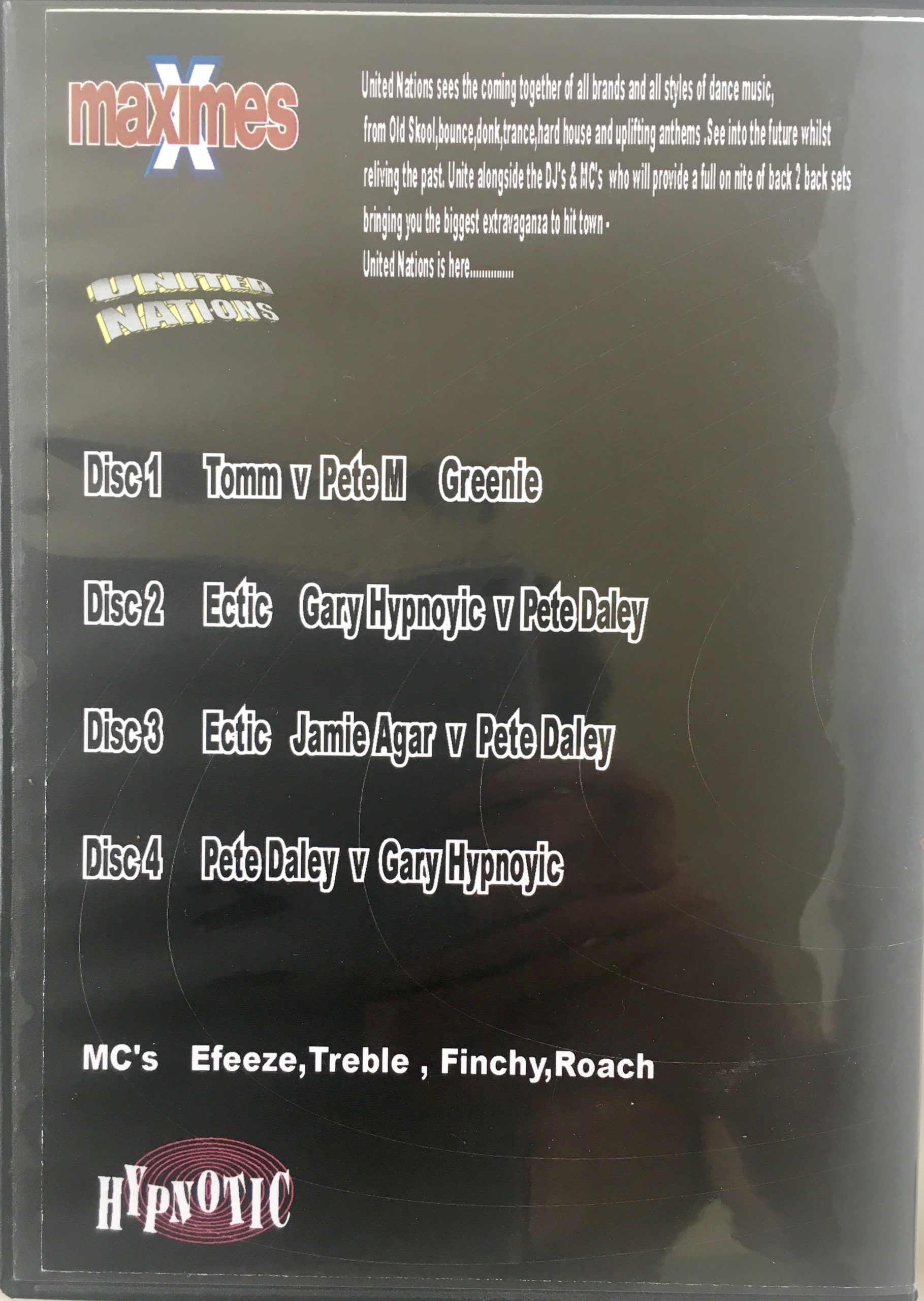 Another night of the biggest and bounciest tunes around brought to you straight from Maximes Nightclub, Wigan UK. This 4 x CD pack was recorded live at their Maximes United Nations event on Saturday April 29th 2006 and features DJ`s Tomm, Pete M, Greenie, Ectic, Gary Hypnotic, Pete Daley, Jamie Agar and MC`s Efeeze, Treble, Finchy and Roach.