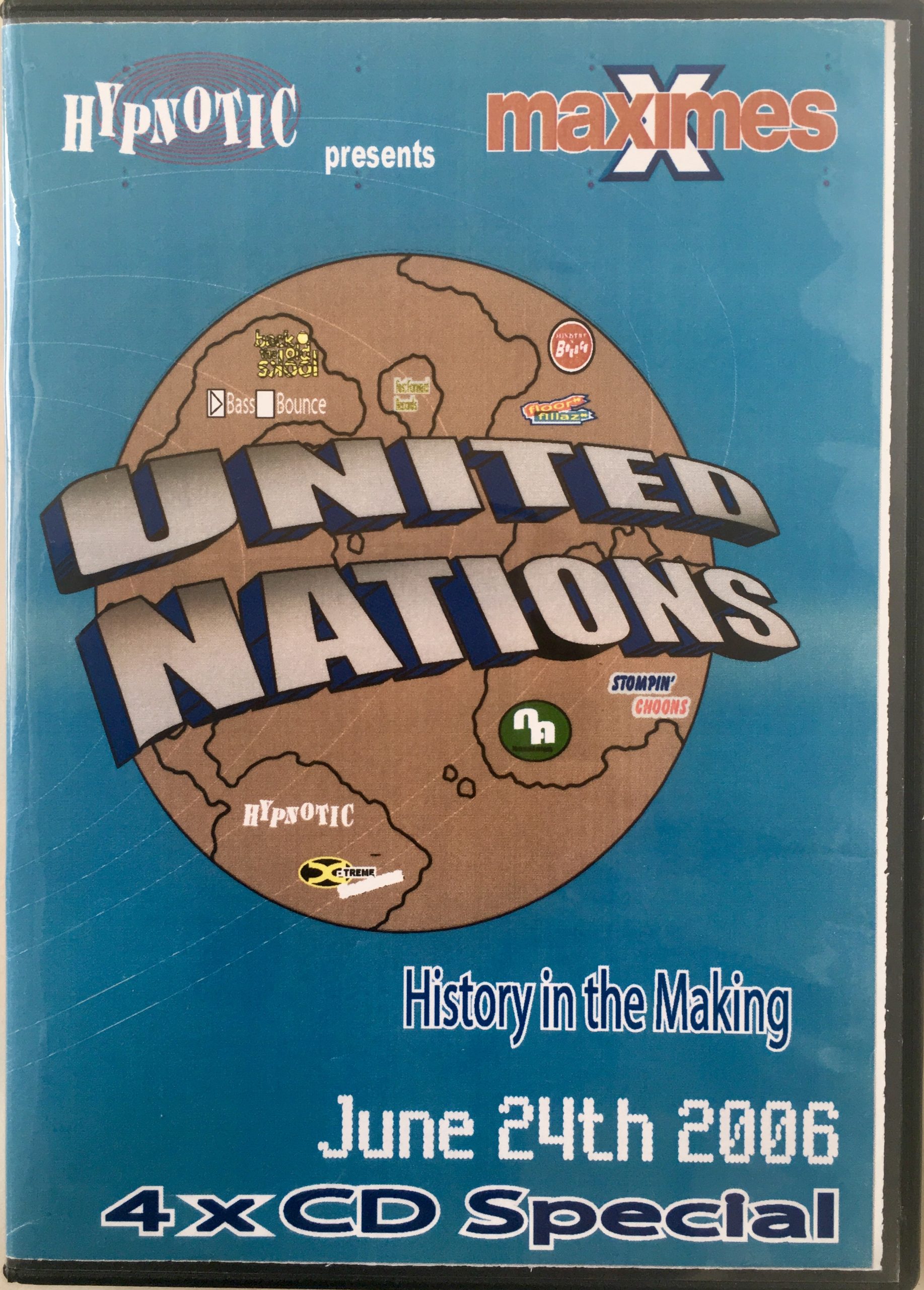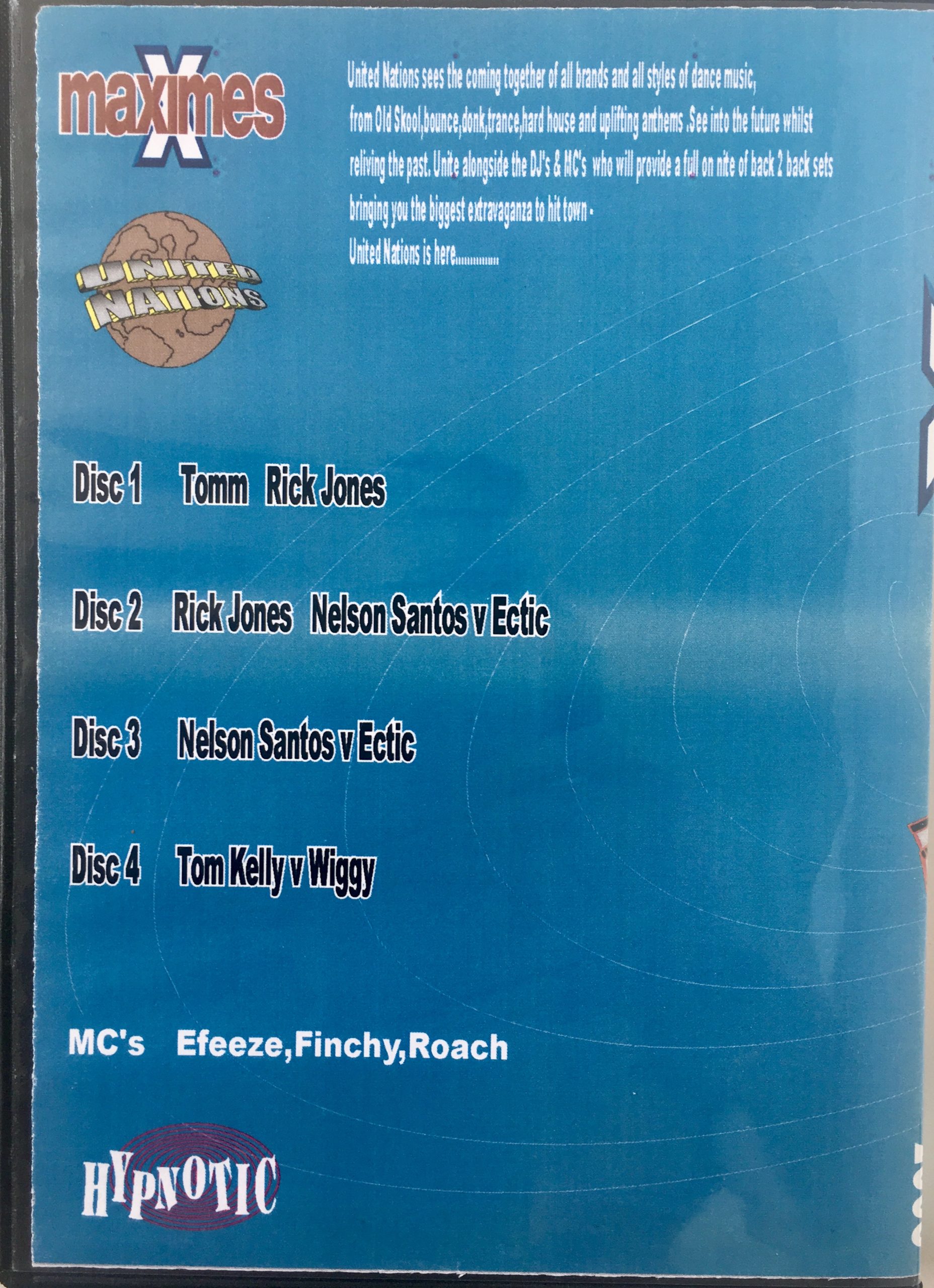 Another night of the biggest and bounciest tunes around brought to you straight from Maximes Nightclub, Wigan UK. This 4 x CD pack was recorded live at their Maximes United Nations event on Saturday June 24th 2006 and features DJ`s Tomm, Rick Jones, Nelson Santos, Ectic, Tom Kelly, Wiggy and MC`s Efeeze, Finchy and Roach.