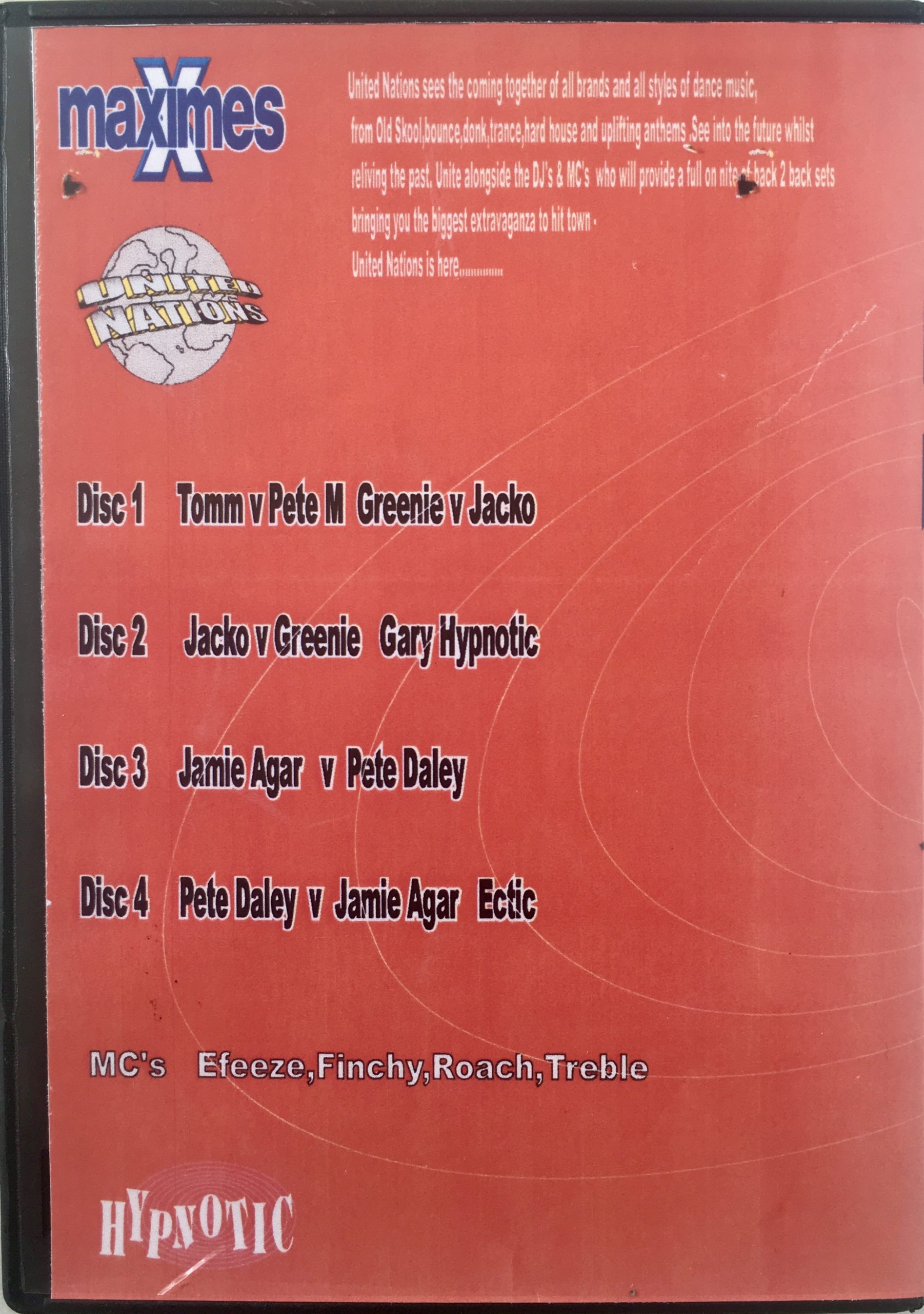 Another night of the biggest and bounciest tunes around brought to you straight from Maximes Nightclub, Wigan UK. This 4 x CD pack was recorded live at their Maximes United Nations event on Saturday September 30th 2006 and features DJ`s Tomm, Pete M, Greenie, Jacko, Gary Hypnotic, Jamie Agar, Pete Daley plus MC’s on the mic Efeeze, Finchy, Roach and Treble.