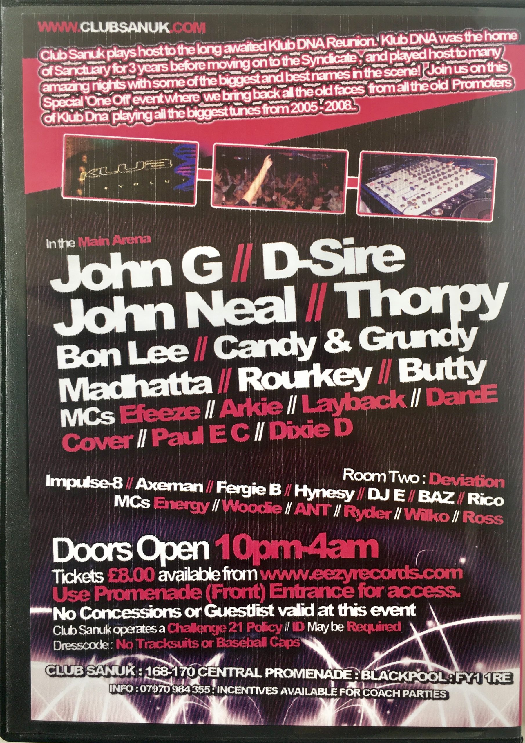 Hot 4xCD pack from The Official Klub DNA Re-Union recorded live at Sanuk, Blackpool on Friday 30th September 2011. A huge line-up featuring John G, D-Sire, John Neal, Thorpy, Bon Lee, Candy & Grundy, Madhatta, Rourkey, Butty and MC’s Efeeze, Arkie, Layback, Dan:E, Cover, Paul EC and Dixie D. Massive !!!