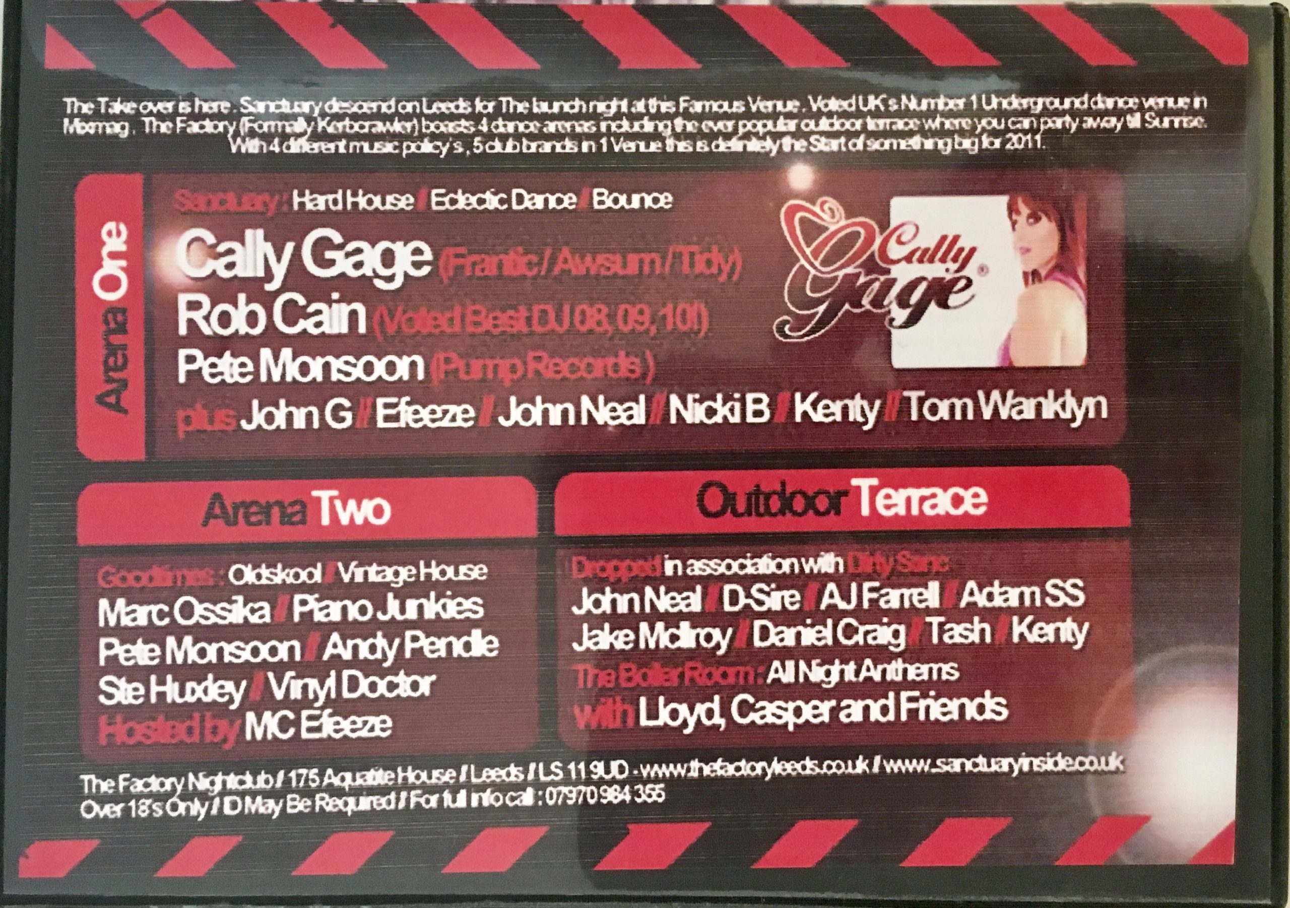 Awesome 4 x CD pack from the Santuary crew recorded live at The Factory, Leeds on Friday 1st July 2011. Featuring 4 Arenas of the best dance music, Arena One : Cally Gage, Rob Cain, Pete Monsoon plus John G, Efeeze, John Neal, Nicki B, Kenty and Tom Wanklyn. Arena Two (hosted by MC Efeeze) : Marc Ossika, Piano Junkies, Pete Monsoon, Andy Pendle, Ste Huxley, Vinyl Doctor. Outdoor Terrace (in association with Dirty Sanc) John Neal, D-Sire, AJ Farrell, Adam SS, Jake McIlroy, Daniel Craig, Tash, Kenty. The Boiler Room : All Night Anthems with Lloyd, Casper and friends.Big big big !